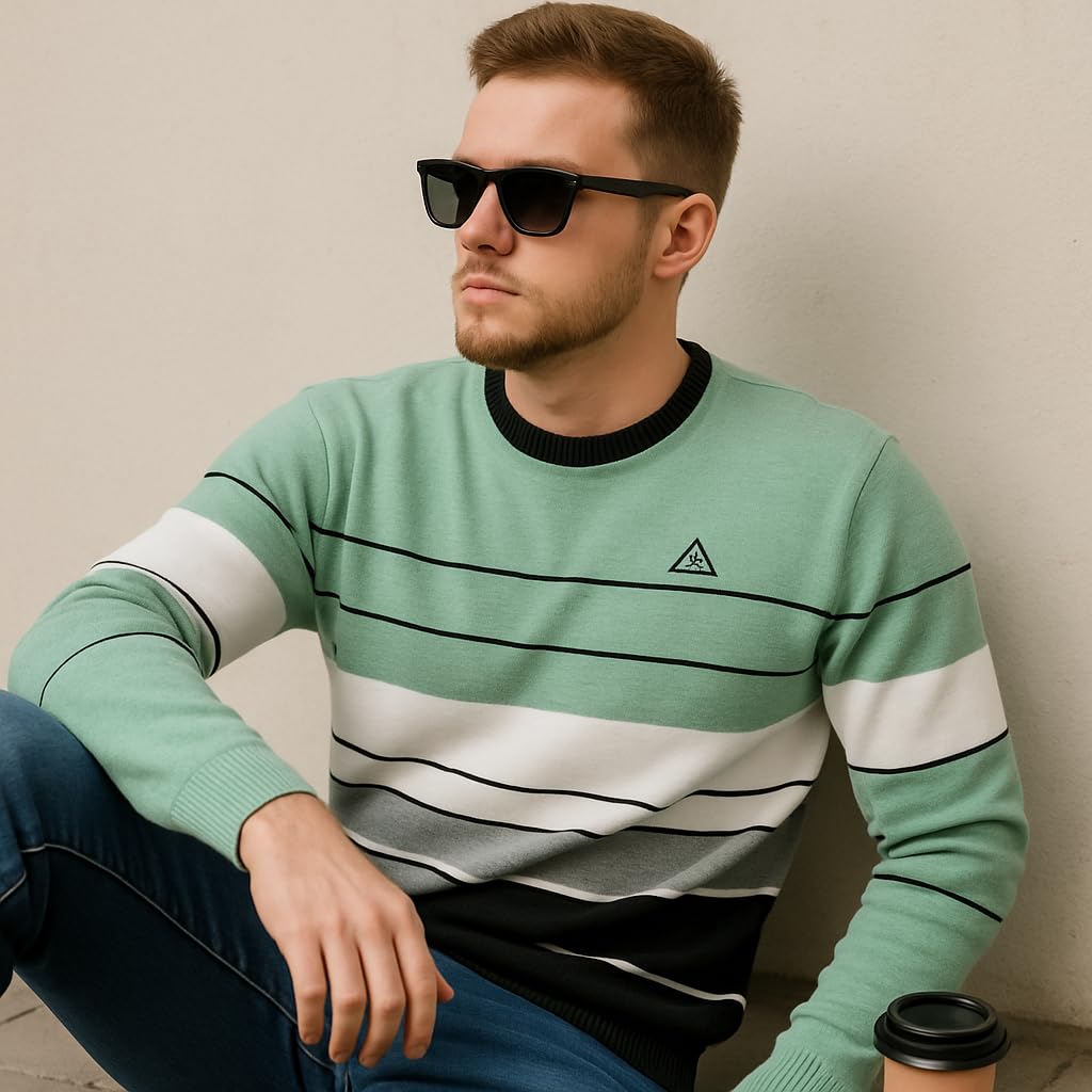 Stay warm and stylish this winter with this sophisticated men’s woolen sweater. The eye-catching multicolour striped pattern adds a contemporary touch to your winter wardrobe, while the classic round neck design ensures timeless appeal. Crafted from wool, this full-sleeve pullover offers excellent warmth and comfort during chilly days. The regular fit silhouette provides ease of movement without compromising on style, making it perfect for casual outings or relaxed office wear. The versatile design pairs beautifully with jeans, trousers, or casual pants, allowing you to create multiple looks. This winter essential combines functionality with fashion, featuring quality knitting that ensures durability. The comfortable fit and cosy fabric make it an ideal choice for daily wear throughout the winter season. Layer it over your favourite shirt or wear it on its own – this sweater adapts effortlessly to various styling needs.