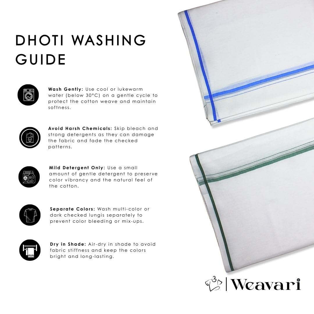 Experience comfort, purity, and tradition with the Weavari Pure Cotton Dhoti – Blue & Green (Pack of 2). Made from soft, breathable cotton, this 2.25 meter unstitched dhoti ensures a smooth, elegant drape perfect for temple visits, homams, pooja rituals, weddings, and cultural celebrations. The stylish Blue and Green borders add a touch of vibrance to the classic white veshti while maintaining traditional authenticity. Lightweight, quick-drying, and skin-friendly, this dhoti set stays comfortable and durable, making it ideal for devotional routines and gifting.