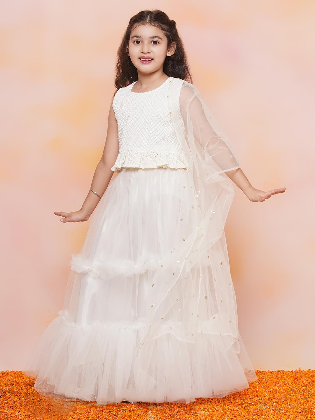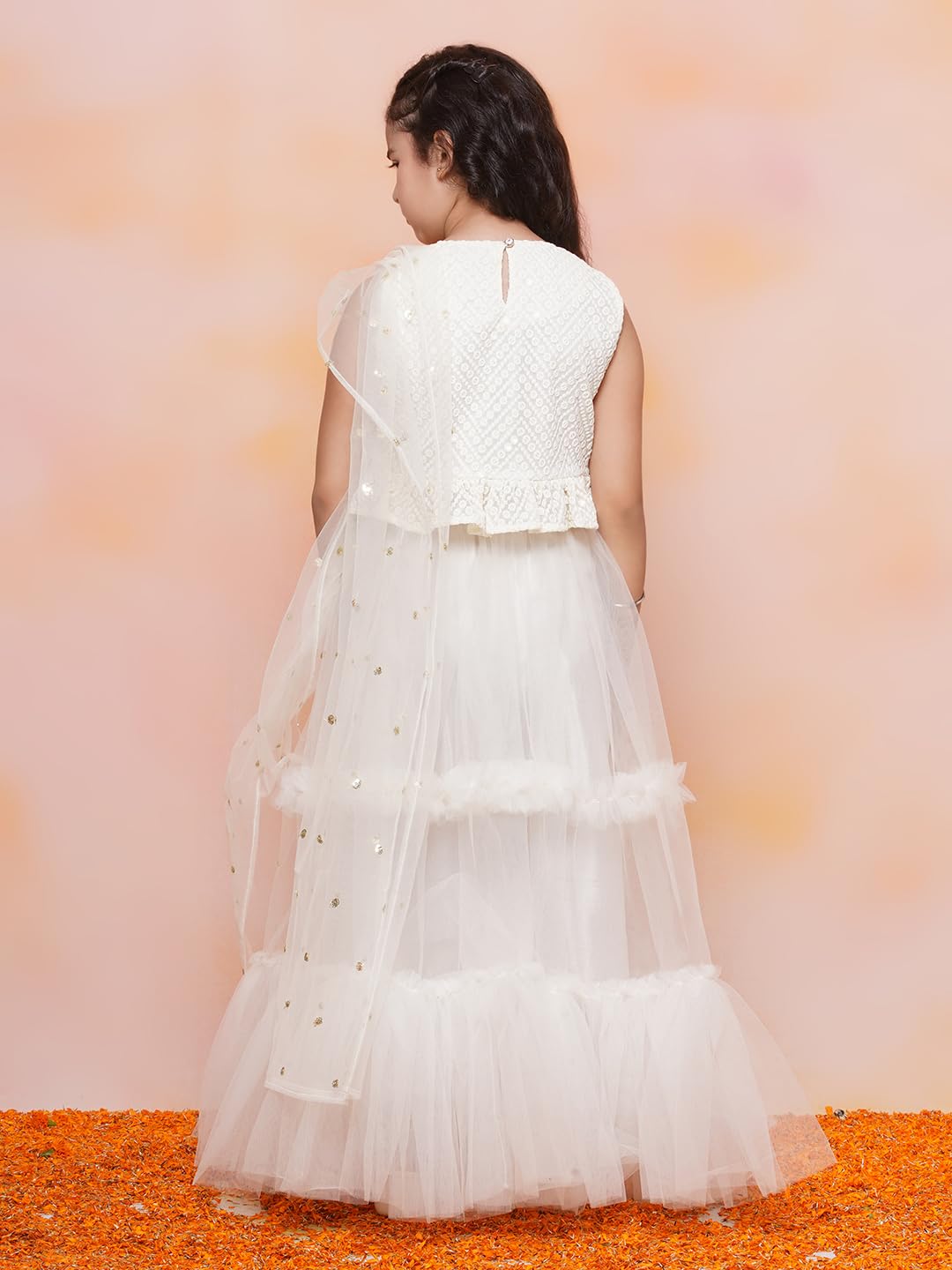 Top Fabric – Chiffli/Georgette | Bottom Fabric – Chiffli/Georgette Package Content – 1 Choli, 1 Lehenga, 1 DupattaFeatures :- Cropped Chikenkari Button Closer Sleeveless Round Neck Choli | Elastic Waistband Printed Lace Work LehengaSpecially Crafted Ethnic Set for the perfect look and comfort for the Festive SeasonOccasion: The Perfect set for Your Young Girls for Festival, Wedding, Birthday Gift and All function wear.