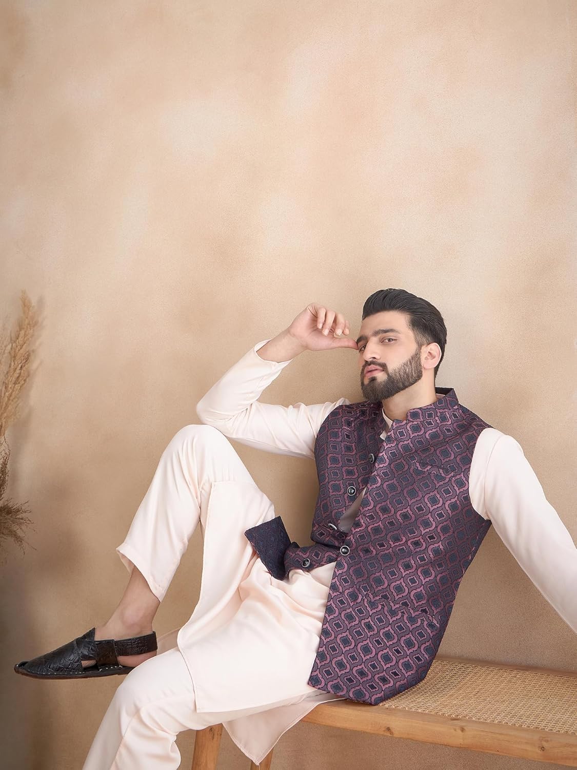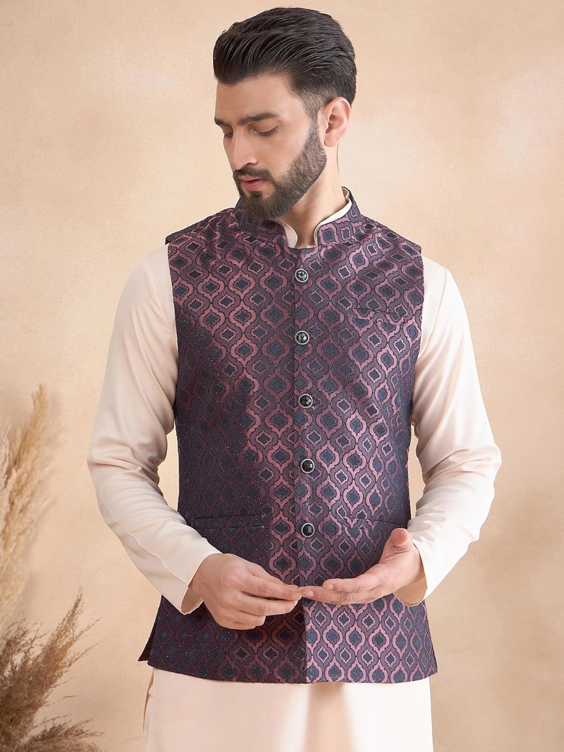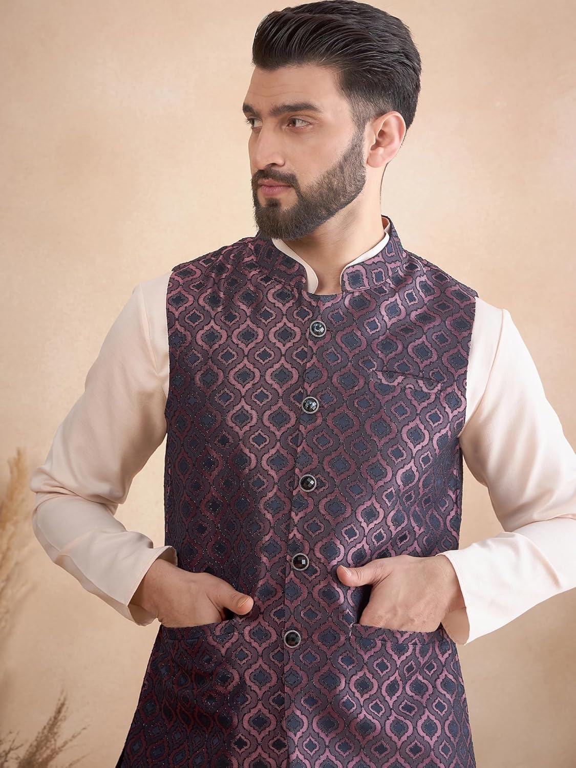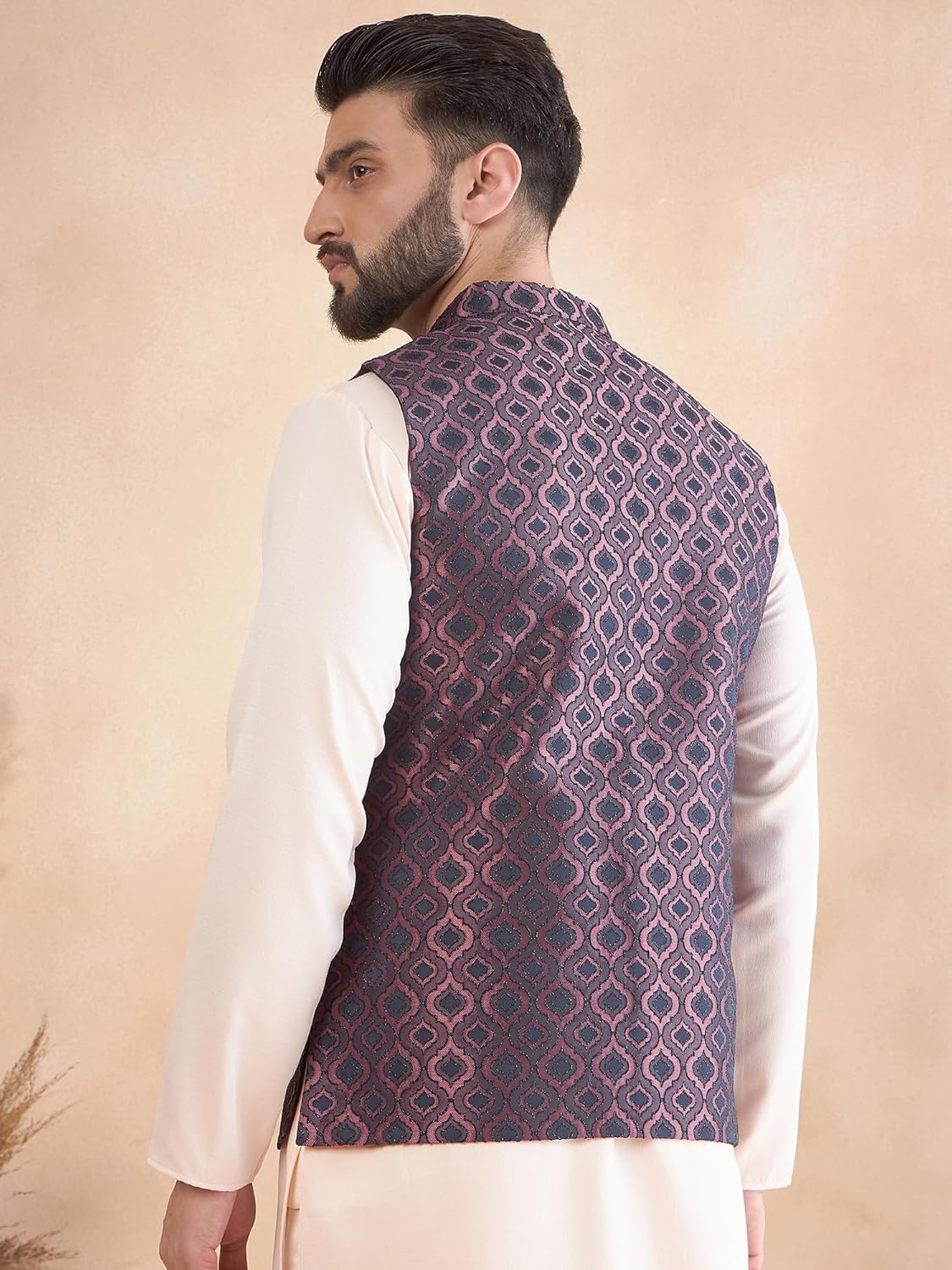 This is a stylish men’s ethnic ensemble featuring a light pink kurta paired with a navy blue Nehru jacket. The jacket has a rich brocade fabric with intricate floral and paisley patterns in red, gold, and subtle accents, giving it a regal and festive look. The mandarin collar, front button closure, and tailored fit make it perfect for weddings, receptions, festive celebrations, or traditional gatherings.