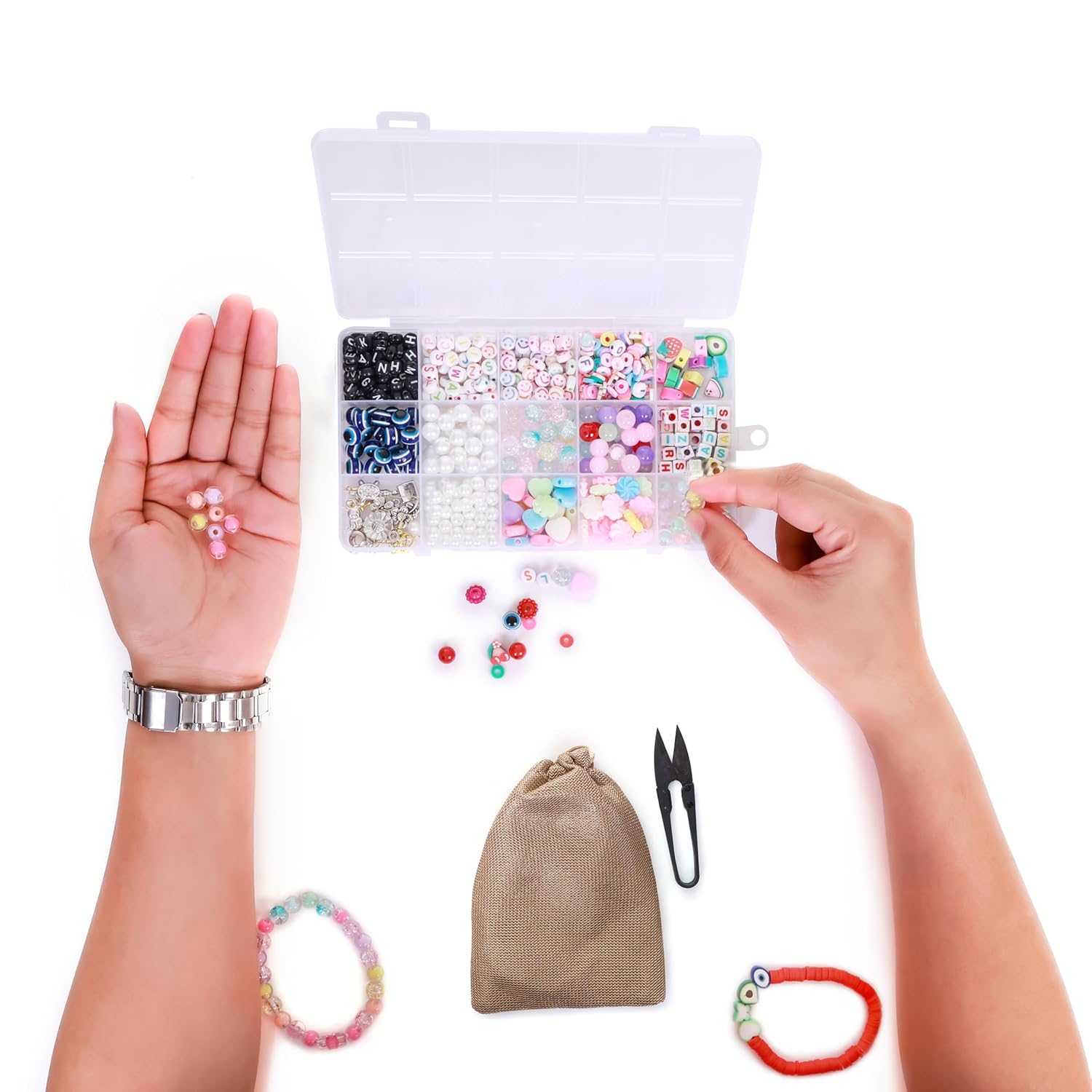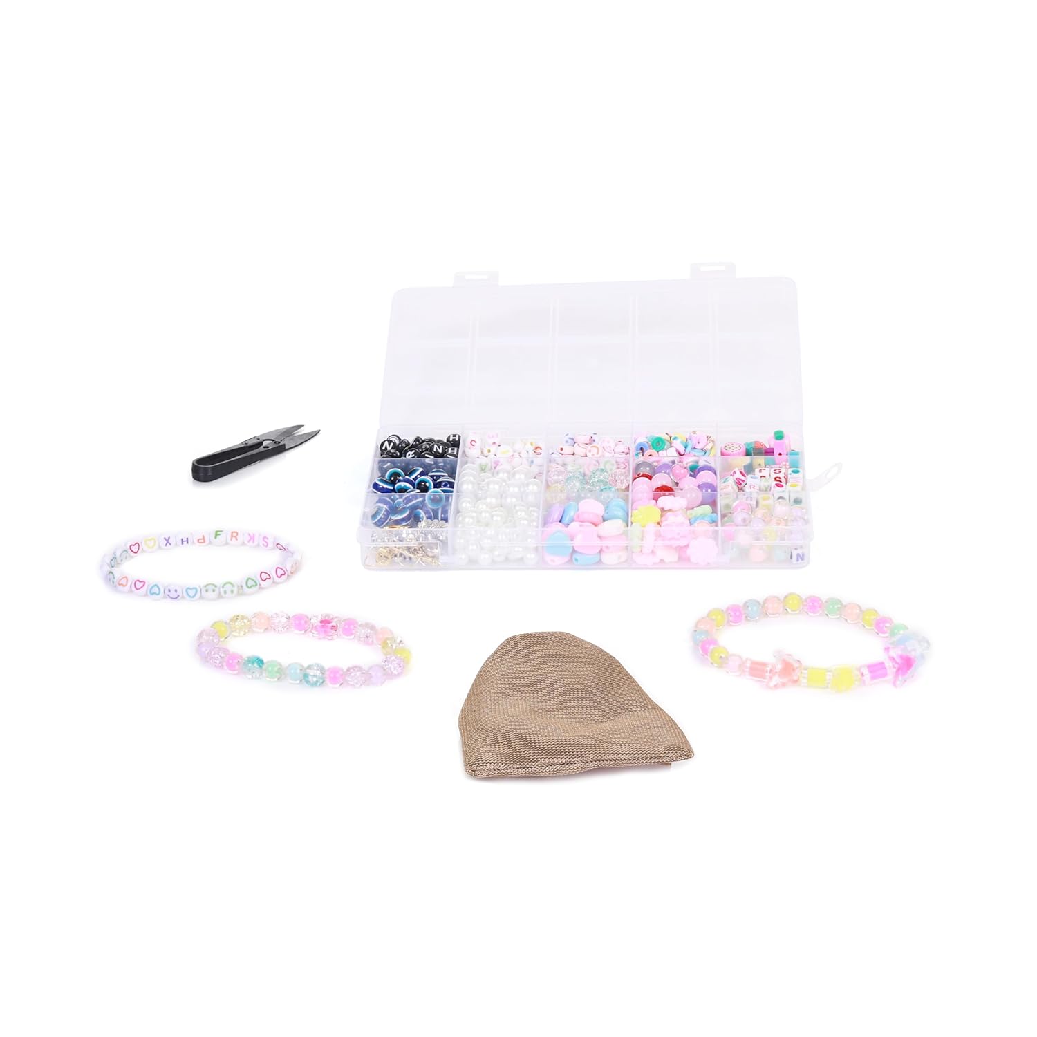 🌈 Vibrant & Diverse Beads: Includes over 400+ beads such as evil eye beads, black and white alphabet beads, smiley face discs, pastel heart beads, glitter balls, candy fruits, and more—sorted in a 15-compartment organizer.
