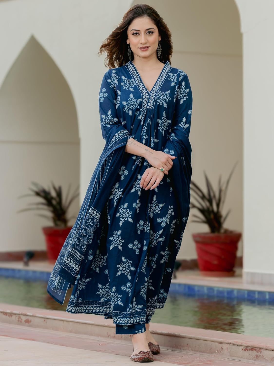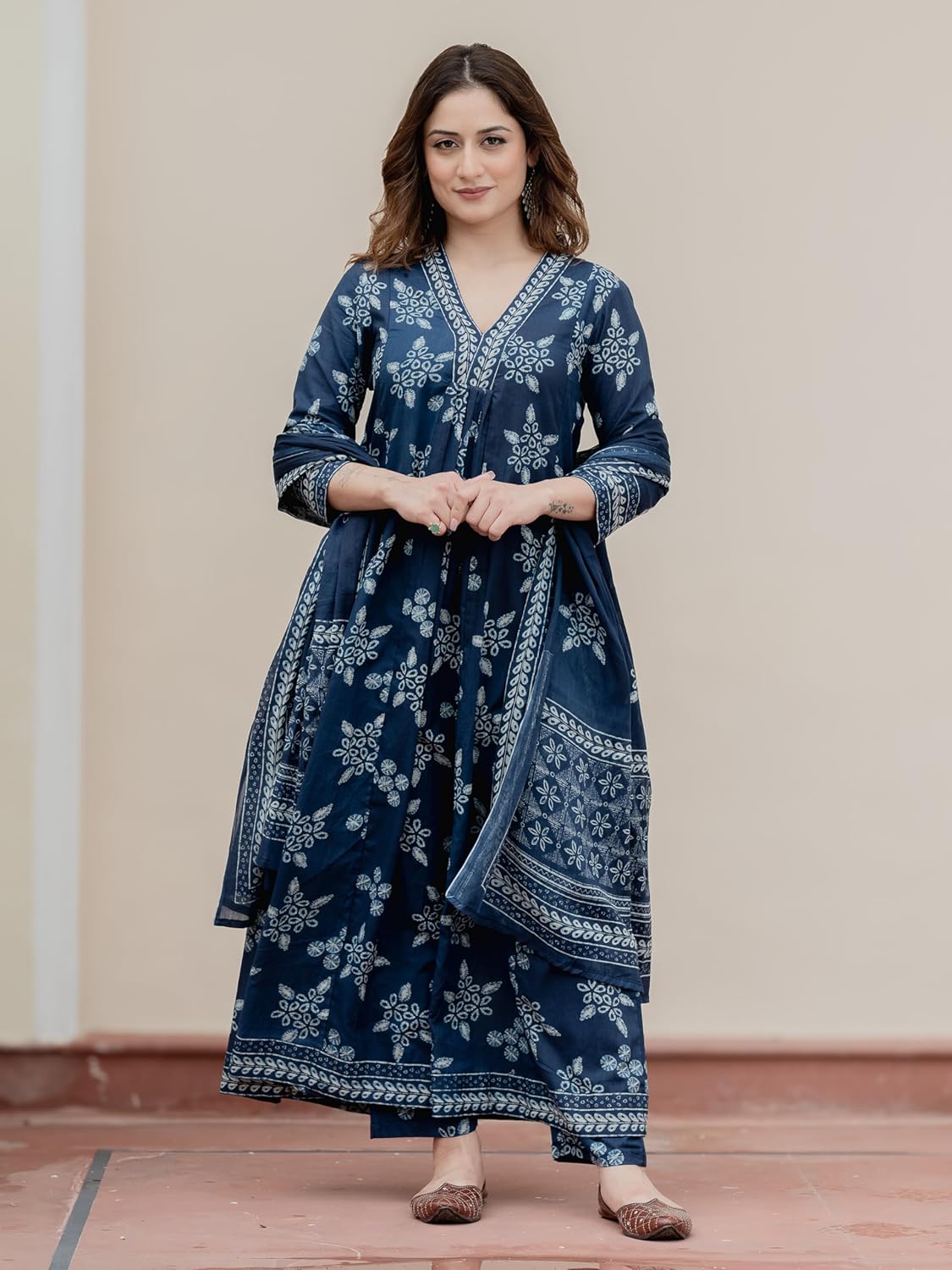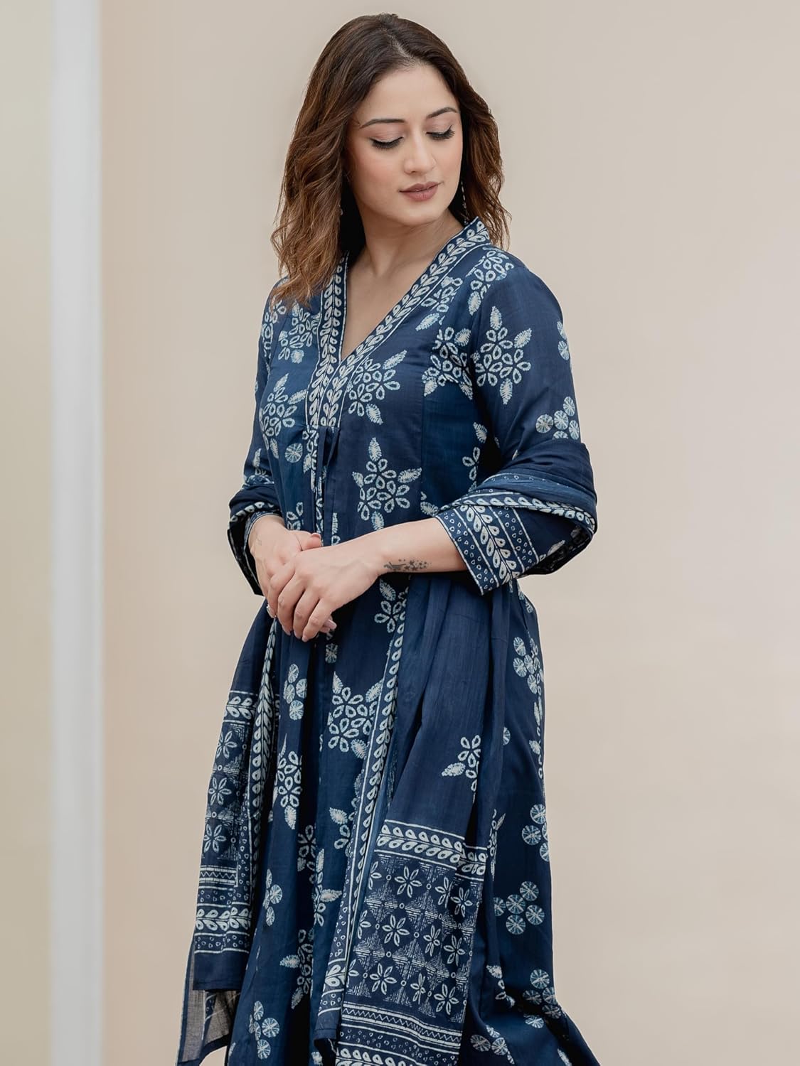 Step into timeless elegance with the Arayna Women’s Pure Cotton Indigo Handblock Printed Kurta Set. Designed with intricate handblock prints on soft, breathable cotton, this 3-piece set includes a beautifully patterned kurta, straight-fit pants, and a coordinated dupatta. The indigo hues add a touch of sophistication, making it perfect for festive celebrations, office wear, casual outings, or traditional events. Experience the perfect blend of comfort, tradition, and style with this versatile ethnic suit set – a must-have addition to your wardrobe
