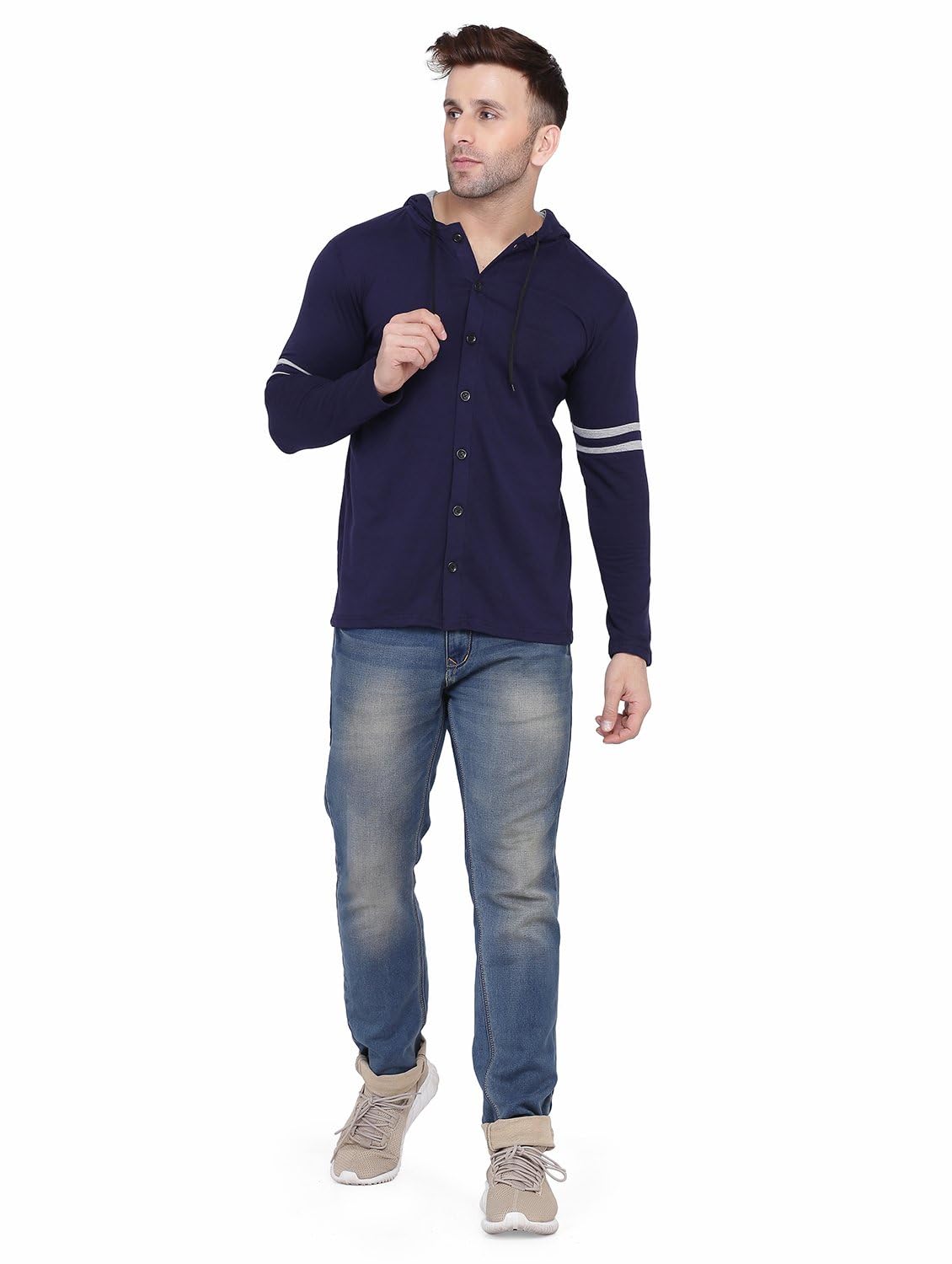 Blisstone Men’s Full Sleeve Hooded T-Shirt with Button Closure & Contrast Striped Sleeves | Stylish Cotton Blend Hoodie for Casual & Sportswear Dark Blue