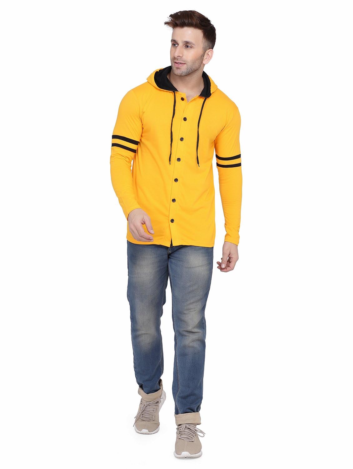 Blisstone Men’s Full Sleeve Hooded T-Shirt with Button Closure & Contrast Striped Sleeves | Stylish Cotton Blend Hoodie for Casual & Sportswear Yellow