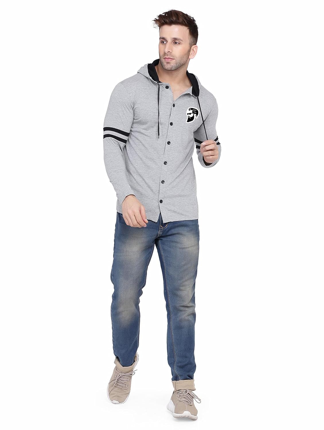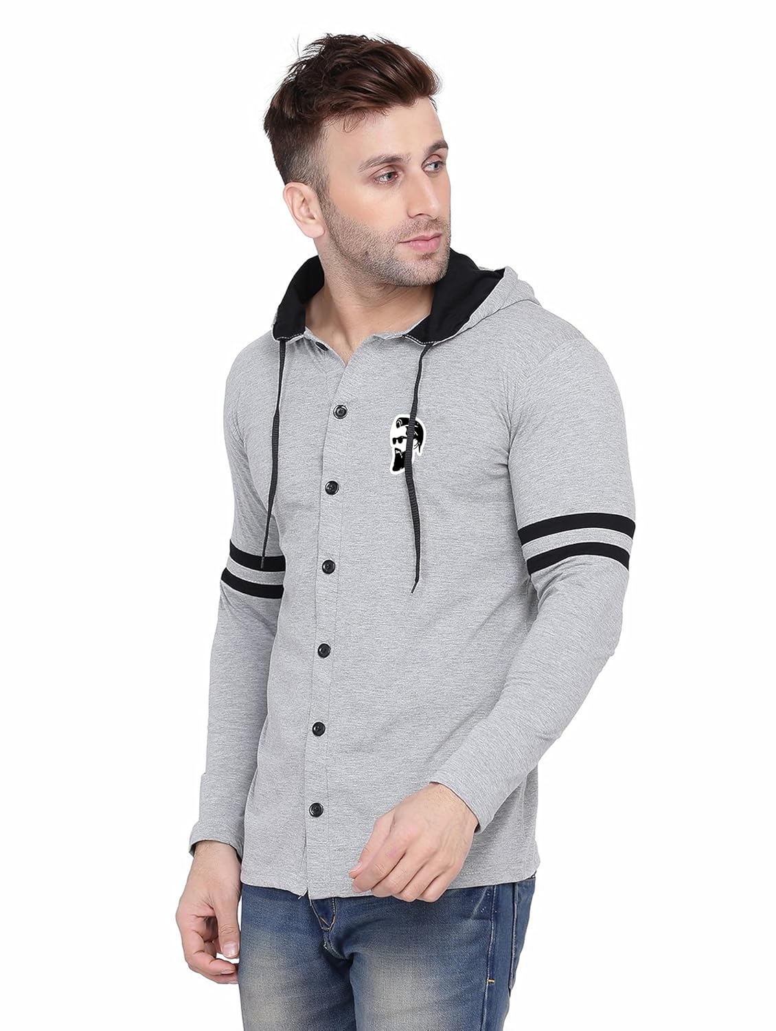 Blisstone Men’s Full Sleeve Hooded T-Shirt with Button Closure & Contrast Striped Sleeves | Stylish Cotton Blend Hoodie for Casual Wear Silver