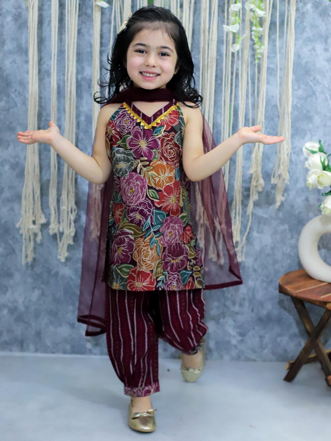 BownBee Girls Floral Halter Neck Kurti Set with Harem Pants and Dupatta, Ethnic Wear for Girls, Traditional Ethnic Set For All Occasion