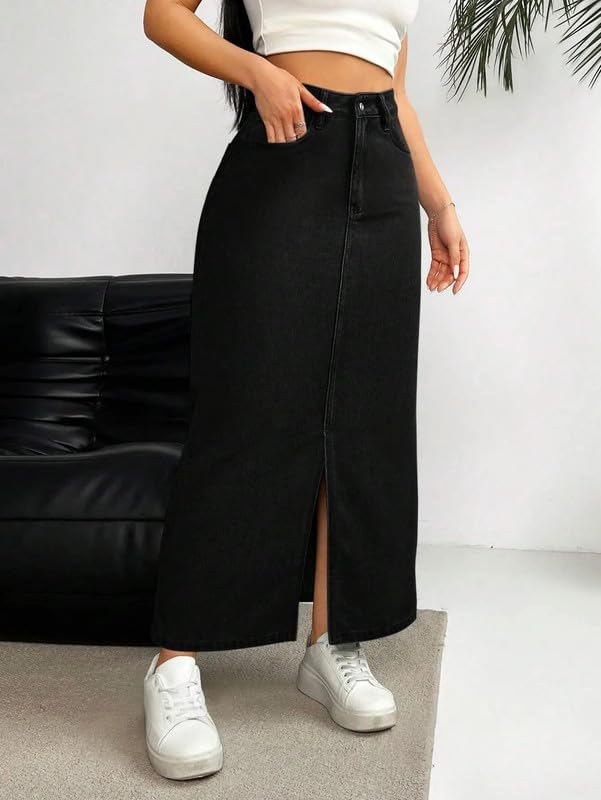 CHALODIA High-Waisted Washed Denim Midi Skirt with Front Slit for Casual and Chic Street Style