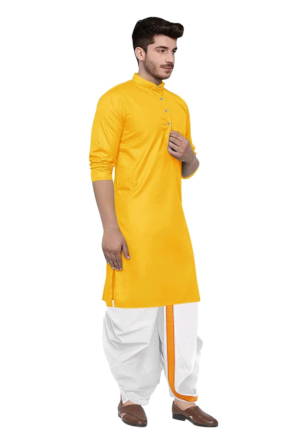 Regal Appearance: The Maharaj dhoti combined with the plain kurta creates a royal and dignified look, perfect for making a grand entrance at formal events.Comfortable Wear: Both the dhoti and kurta are made from soft, breathable fabrics, ensuring you stay comfortable throughout the day.Easy to Maintain: The set is generally easy to care for, with most fabrics being machine washable or requiring minimal upkeep.Timeless Elegance: The classic design ensures that the outfit remains stylish and relevant across different occasions and trends.