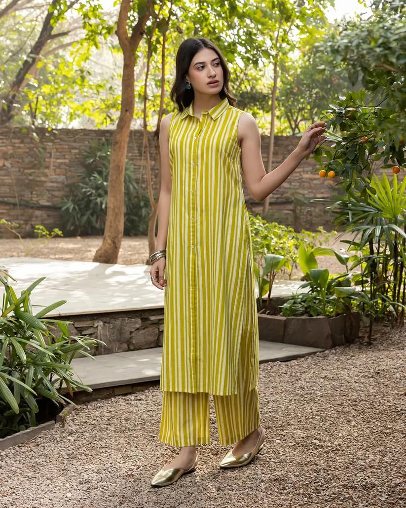 The set includes matching striped straight-fit pants designed to pair seamlessly with the kurti. Made from the same soft, breathable fabric, these pants offer a smooth silhouette, easy movement, and all-day comfort.