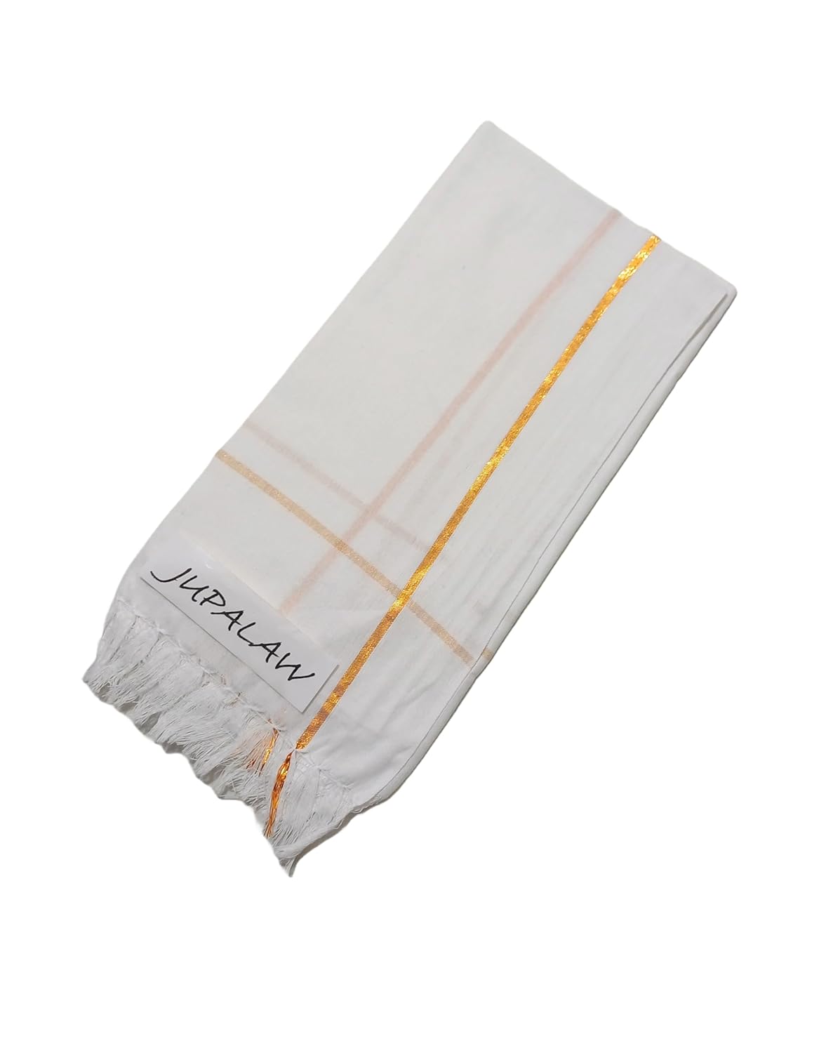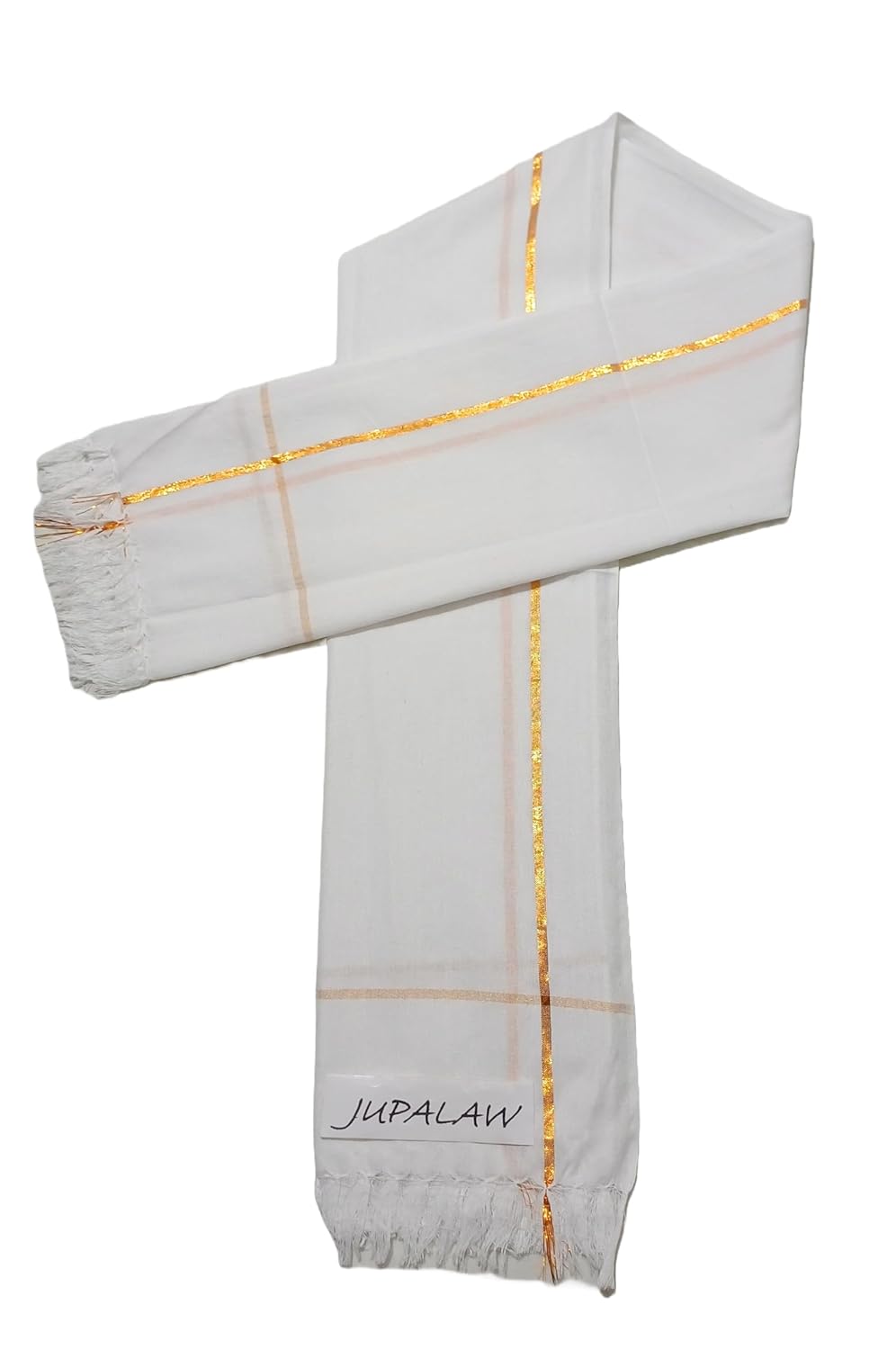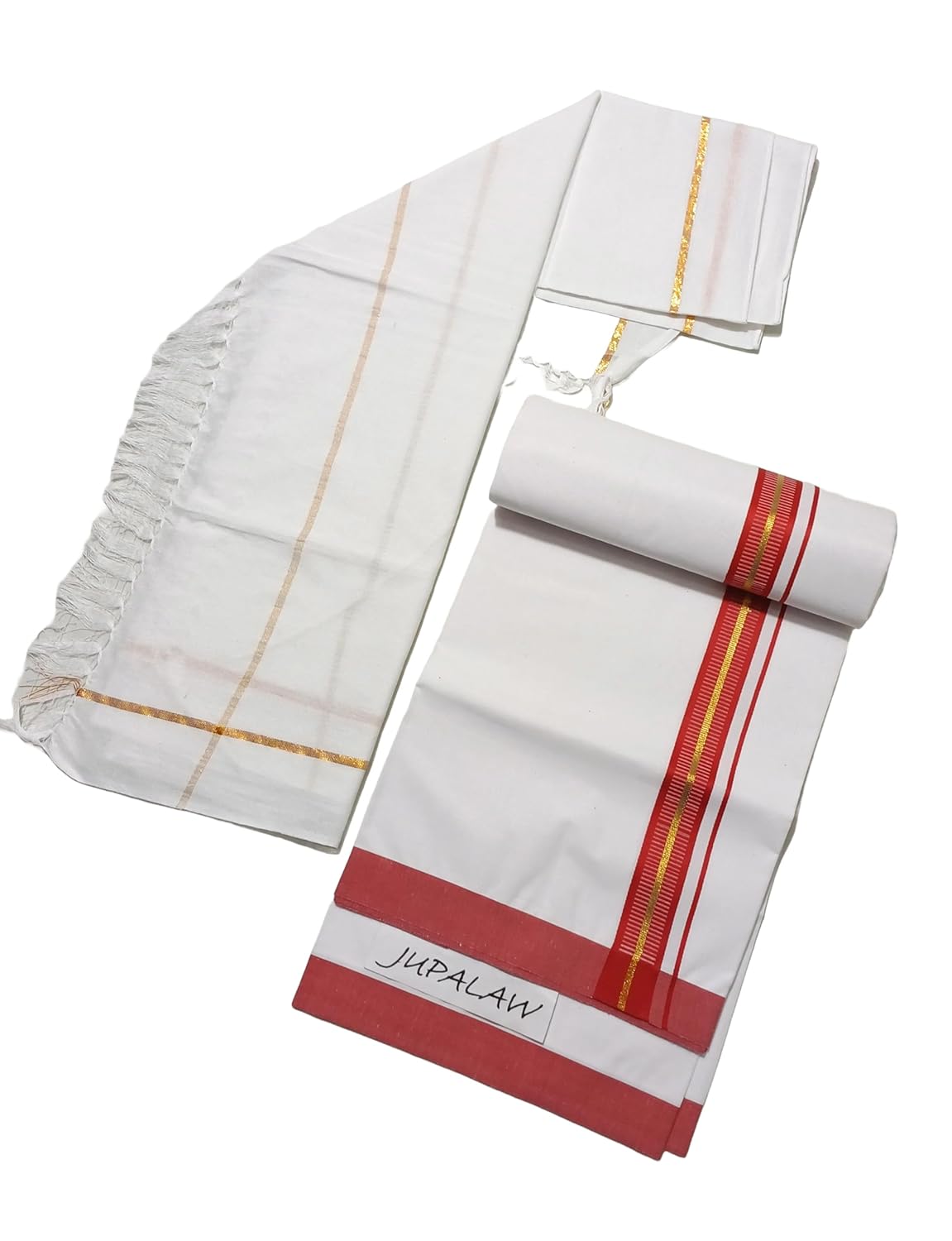 Experience the timeless elegance of traditional Indian attire with this pristine white dhoti set from JUPALAW. This comprehensive ensemble includes a classic dhoti with a distinguished zari border, an angavastram (upper cloth), and a versatile gamcha towel. Crafted from pure cotton, the 2-metre dhoti ensures comfort and breathability while maintaining the authenticity of traditional Indian wear. The zari border adds a touch of sophistication, making it perfect for religious ceremonies, festivals, or cultural celebrations. The matching angavastram completes the traditional look, while the included gamcha towel serves both practical and aesthetic purposes. The cotton fabric ensures comfort in various weather conditions, making it suitable for extended wear. This dhoti set seamlessly combines traditional aesthetics with modern comfort, making it an essential addition to your ethnic wardrobe. The versatile white colour allows for easy matching with different occasions and settings.