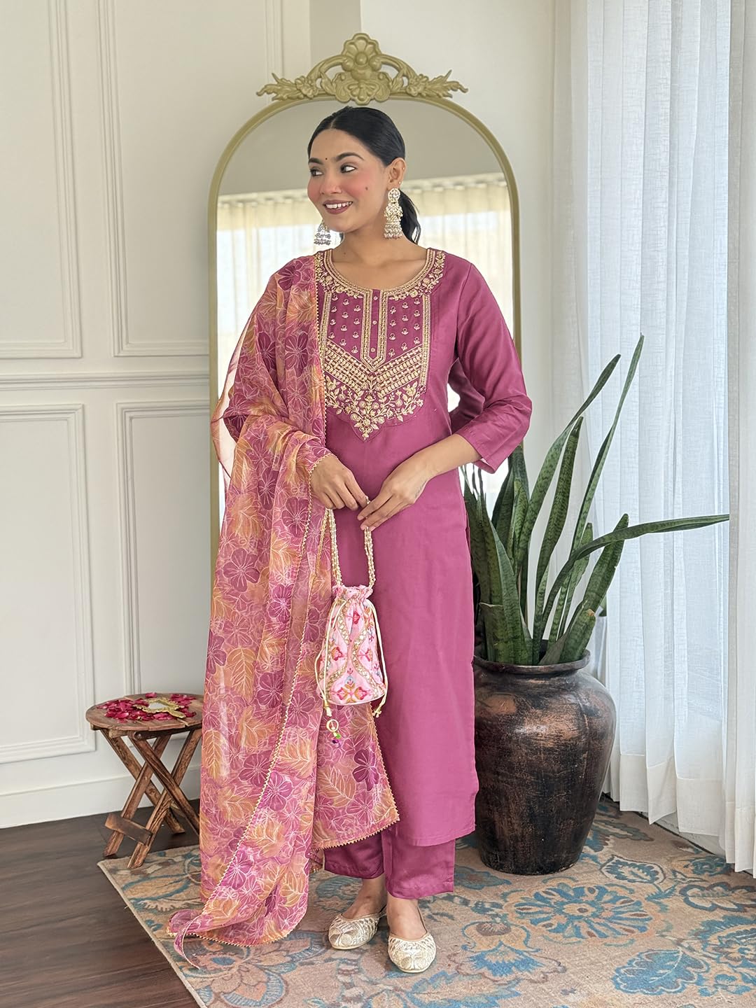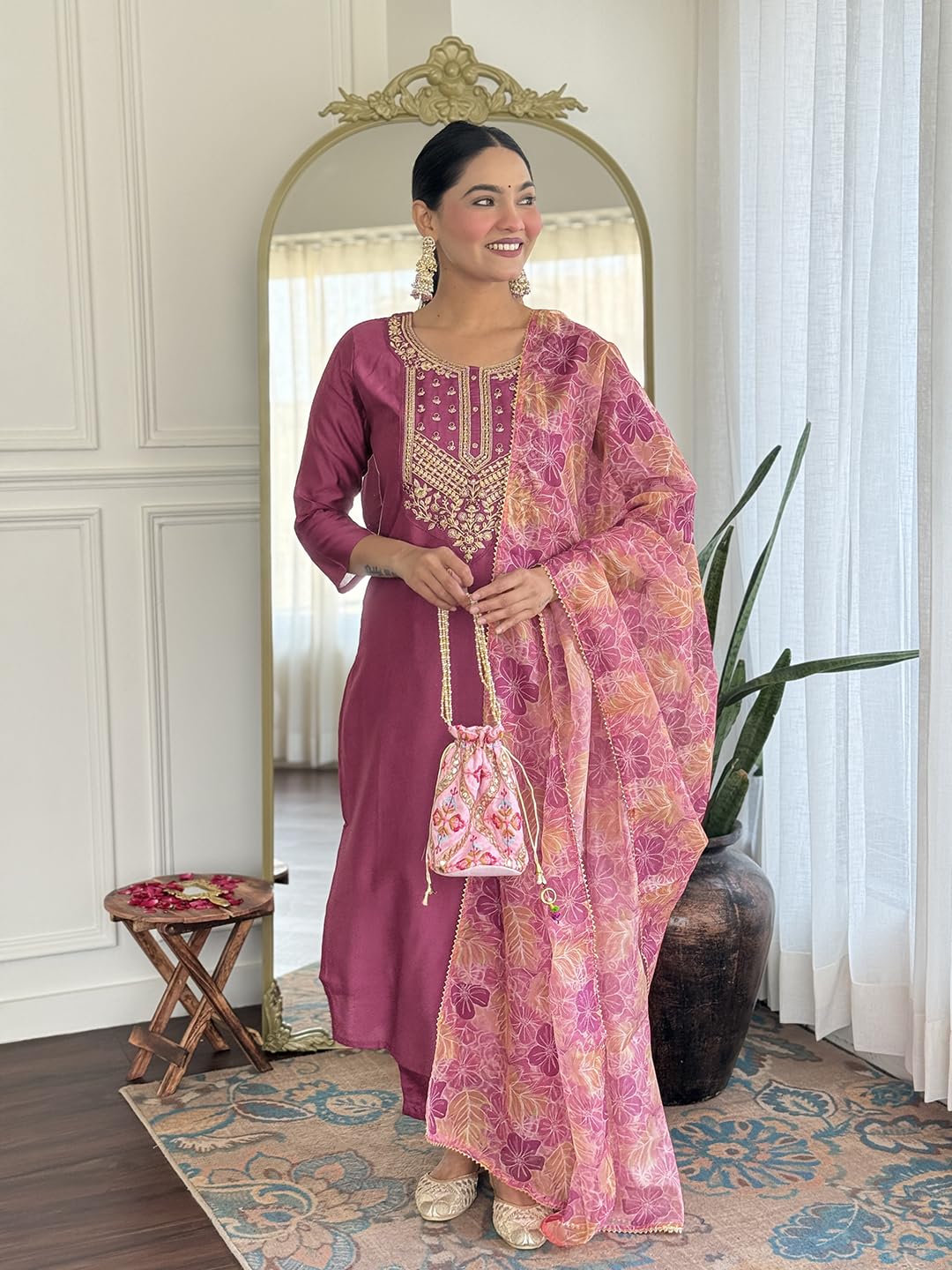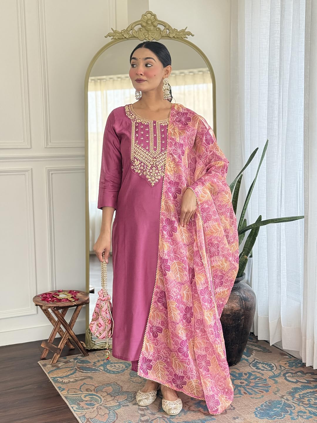 Kurta Fabric – Made of rayon for a comfortable and elegant look.Bottom Fabric – Crafted from rayon to match the kurta with a soft finish.Dupatta Fabric – Designed in pure organza for a lightweight and graceful drape.Work Details – Kurta features delicate embroidery, while dupatta showcases a stylish printed design.Package Contains – 1 complete set including kurta, pant, and dupatta.Size Guide – For the best fit, please check the size chart. If between sizes, select the next larger size.Care Instructions – Hand wash only to maintain fabric quality and design.