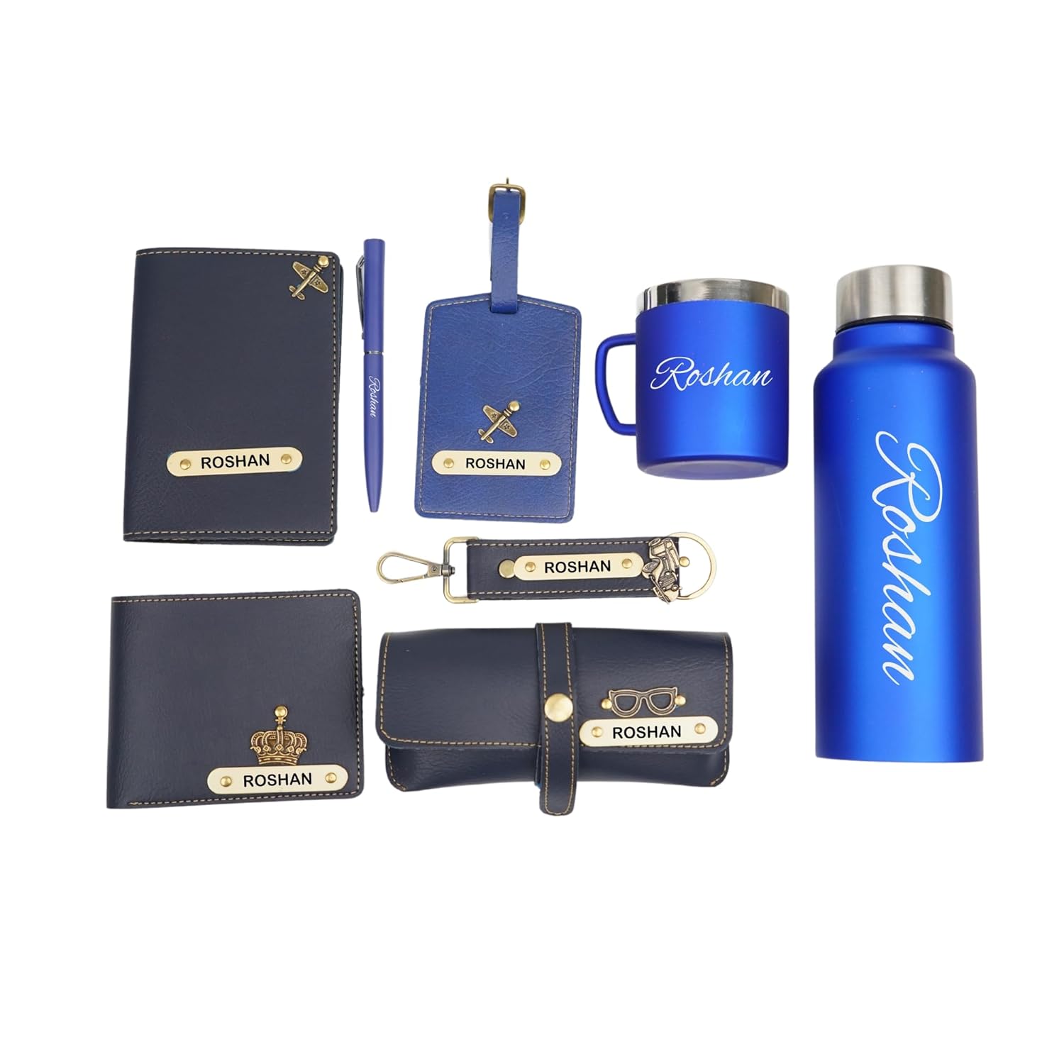 Personalised All in One Gift Combo for Men’s with Name & Charm, Leather Men Wallet, Passport Cover, Water Bottle, Keychain, Customised Pen | Personalised Gifts for Men – (Blue)