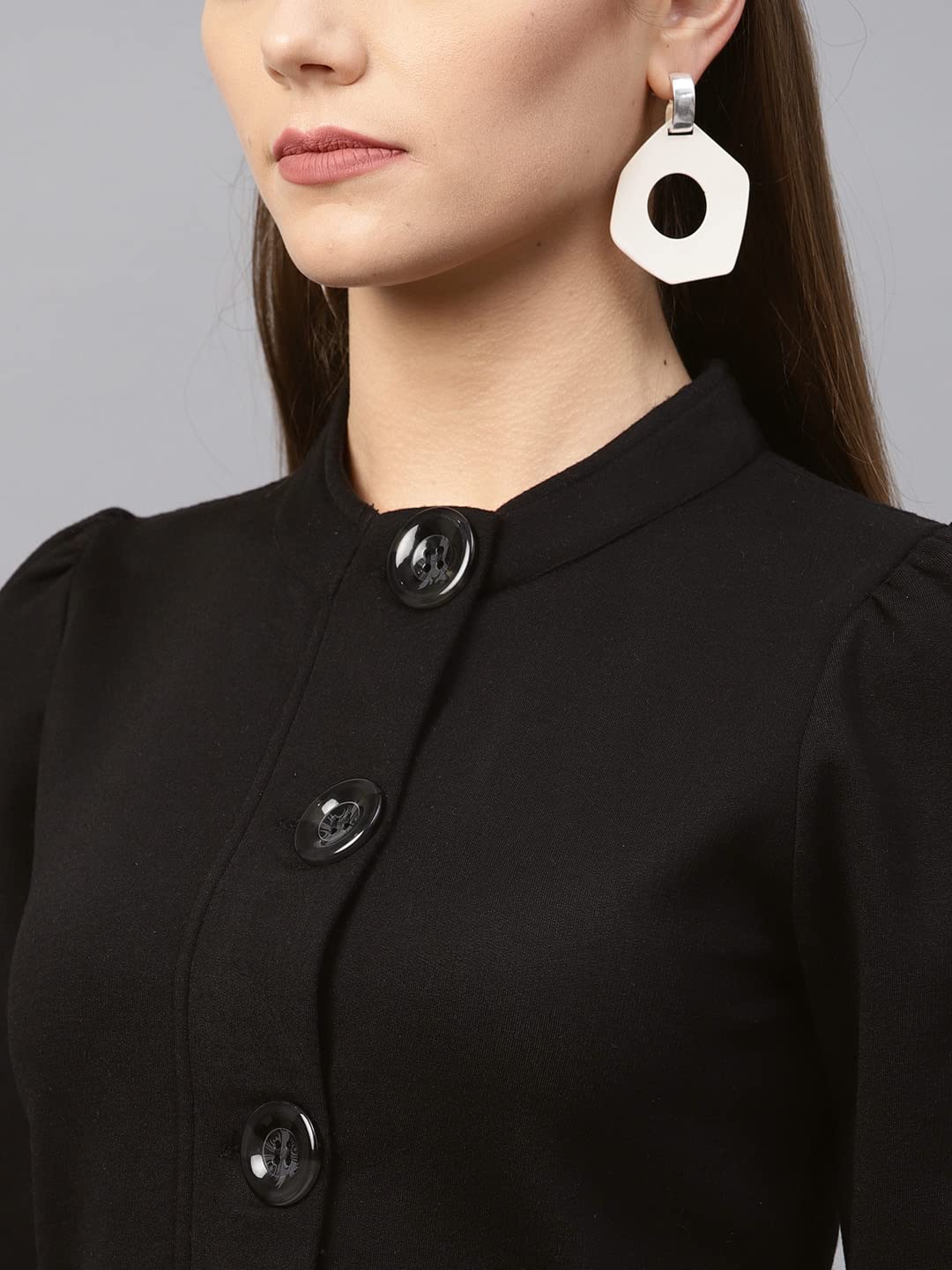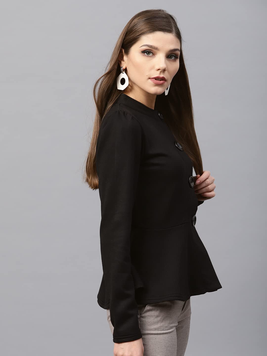 Black Fleece Peplum Jacket, in Fleece fabric, Unlined, Regular Length, Fit & Flare, Button Closure, Flared Hemline and features Peplum Pattern