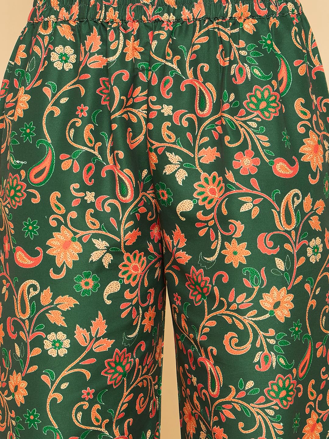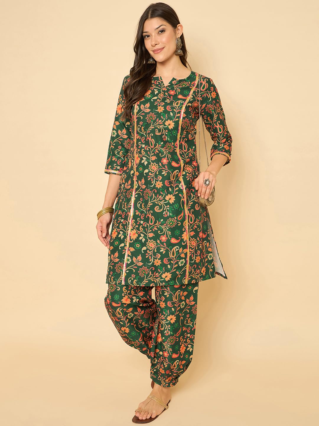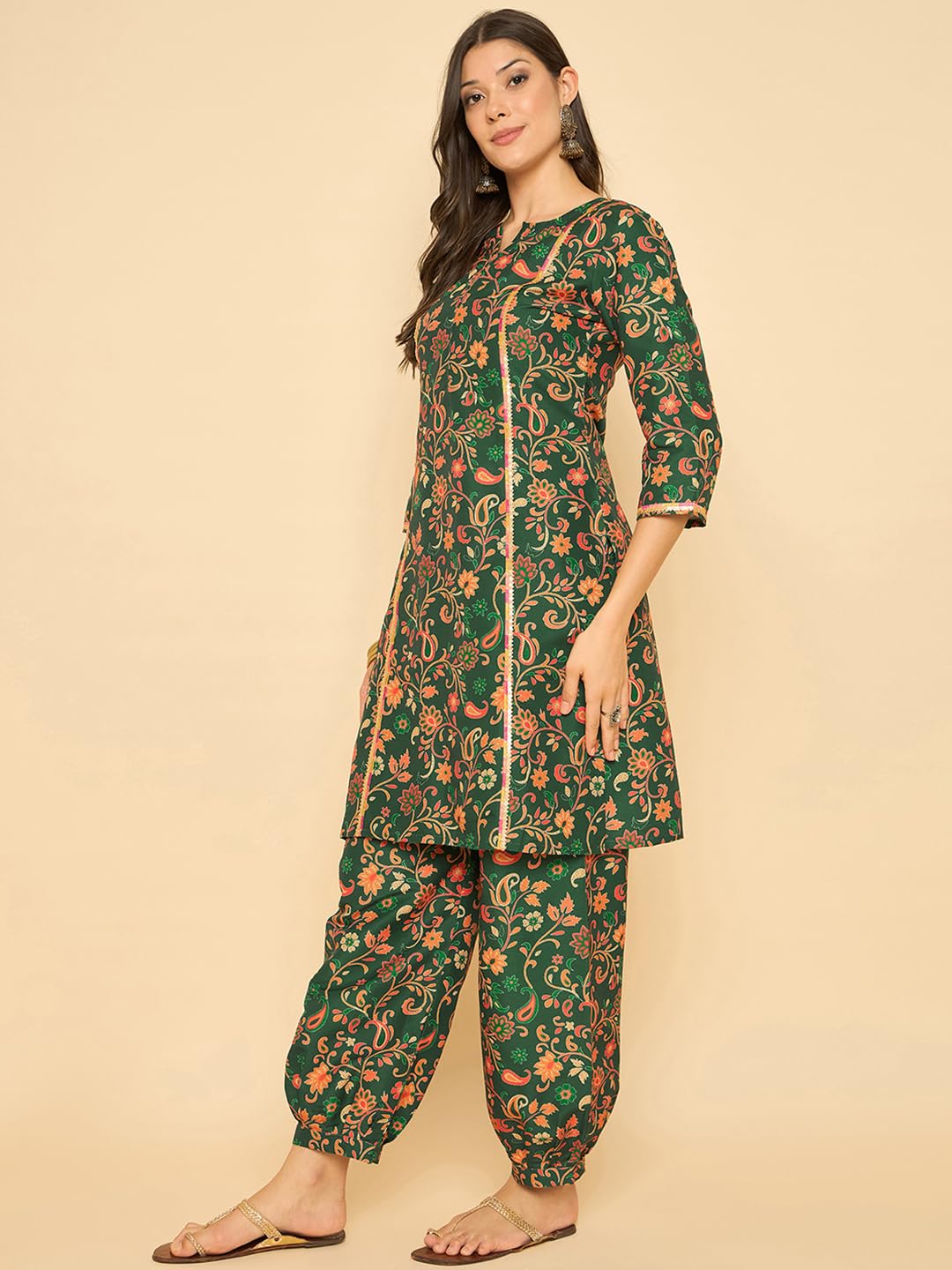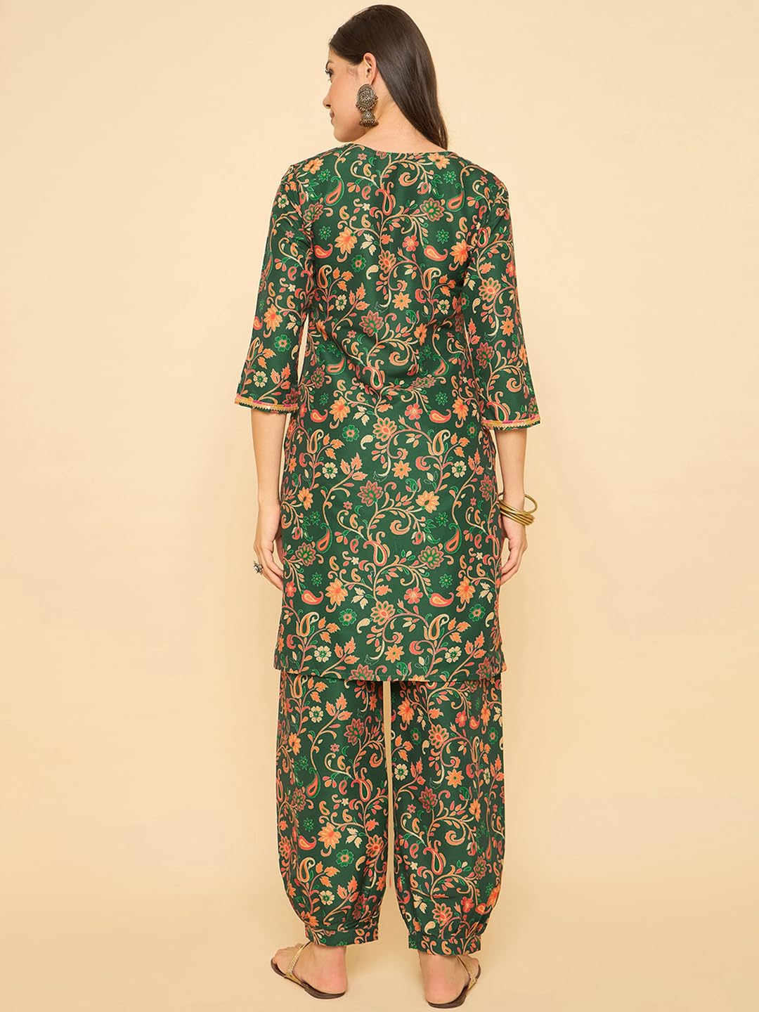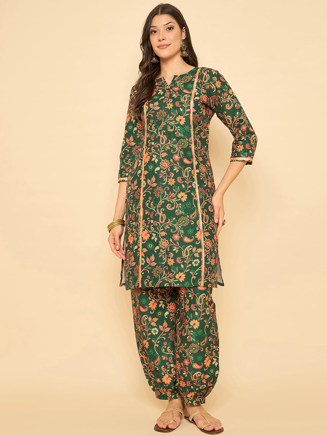 SheWill introduces this vibrant green and multicolor floral printed cotton kurta with matching Patiala Afghan Pants, a perfect fusion of traditional charm and modern comfort for your everyday ethnic wardrobe. Crafted from soft, breathable cotton, this ensemble is designed to keep you at ease throughout the day while radiating timeless elegance. The kurta features a straight cut with a simple round neckline enhanced by a subtle notch, adding a delicate modern twist. Its 3/4 sleeves offer ease of movement and lend a sophisticated appeal, while the intricate multicolor floral motifs create a lively, refreshing aura perfect for casual outings, festive celebrations, or cultural gatherings. The Patiala Afghan Pants come with soft pleats, ensuring a relaxed fit and graceful drape that complements the kurta seamlessly. Lightweight yet stylish, this SheWill set can be effortlessly styled with flats or juttis for a minimal look, or elevated with statement jewelry and heels for festive occasions. Its versatile design allows you to wear it for office ethnic days, family get-togethers, pujas, or day-long celebrations without compromising on comfort. The rich green background beautifully contrasts with the vibrant floral patterns, creating a sophisticated, feminine aesthetic. As part of SheWill’s commitment to high-quality ethnic fashion, this set is designed to last while offering both style and functionality. Add this kurta with Patiala Afghan Pants to your collection to experience effortless ethnic elegance that works for multiple occasions.