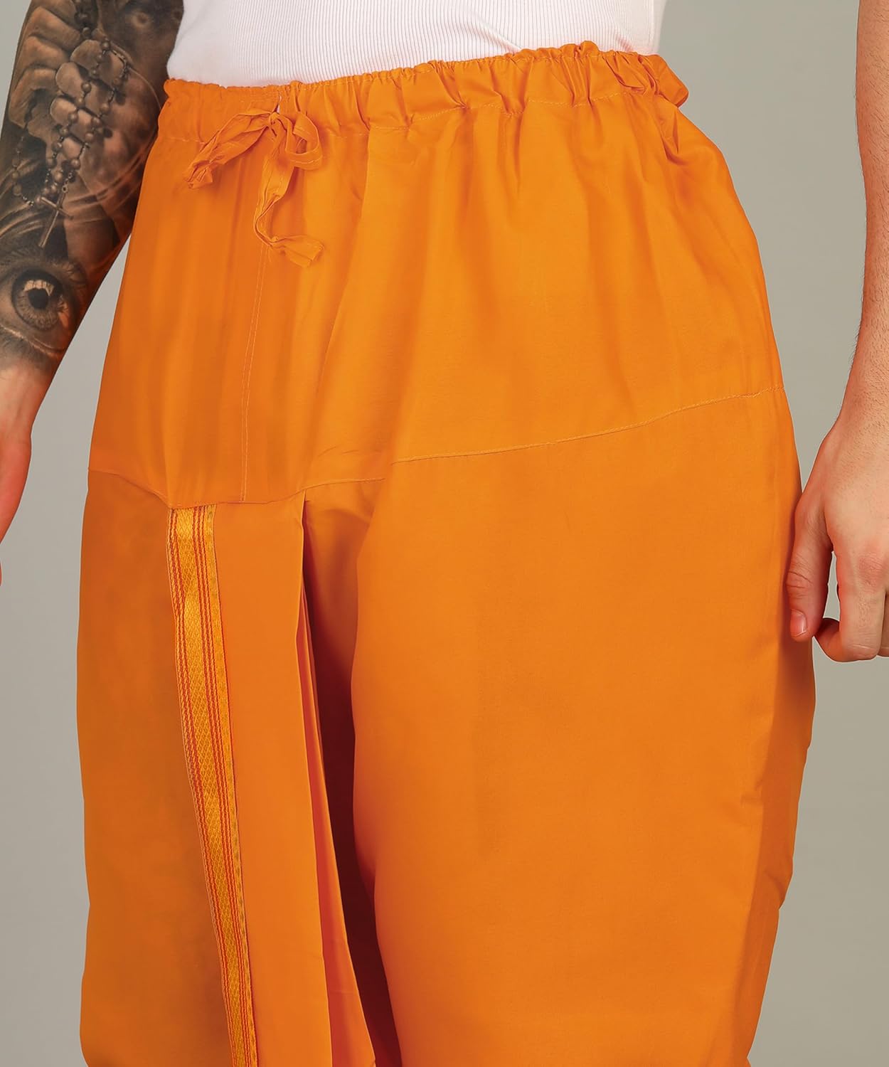 Be the first to review “Shree Aparajeet Creations Mens Panjakejam Readymade Golden Zari Border Elastic Drawsting Waist Band Dhoti Silk Free Size” Cancel reply