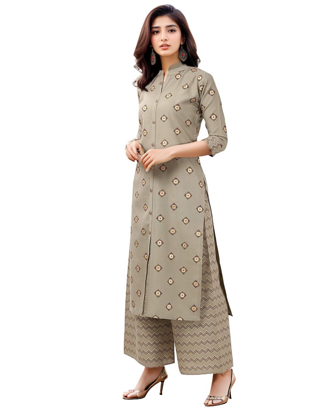 SMOWKLY Premium Women’s Cotton Blend Motif Chevron Print Kurta Palazzo Set || Regular Fit 3/4 Sleeve Chinese Collar || Modern Ethnic Outfit for Casual & Office Wear
