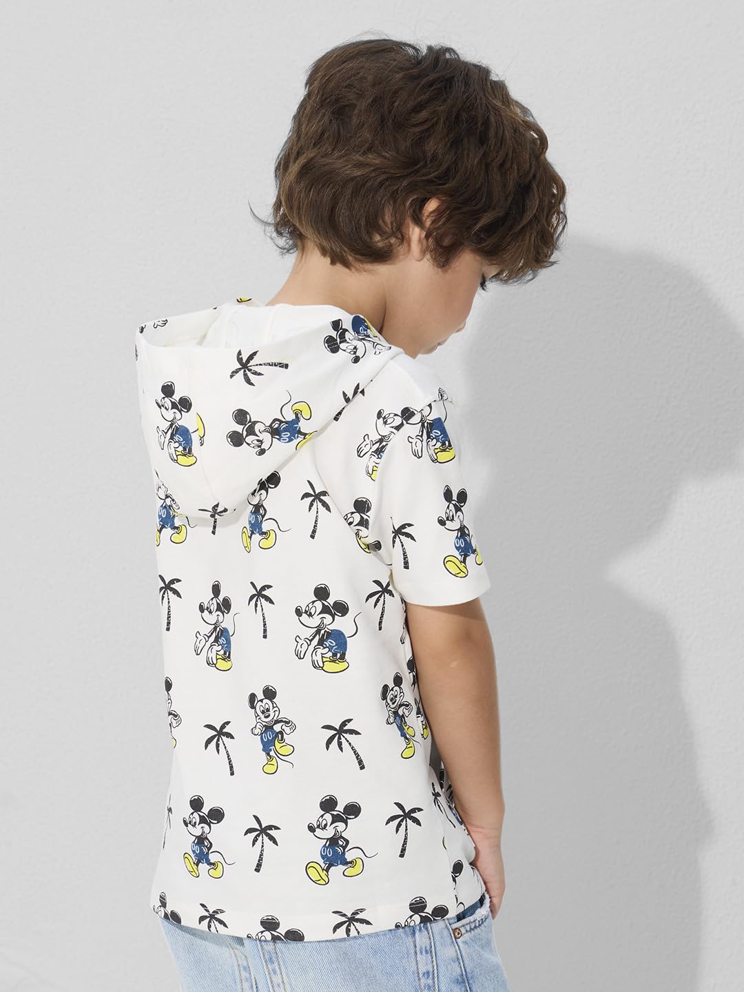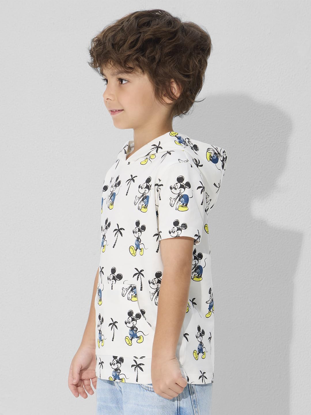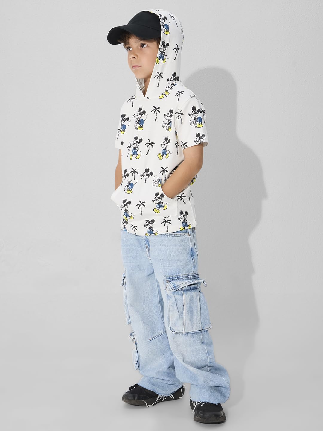 The Souled Store Mickey Mouse: Beach Vibes Boys Short Sleeves White All Over Printed Cotton Hooded T-Shirts