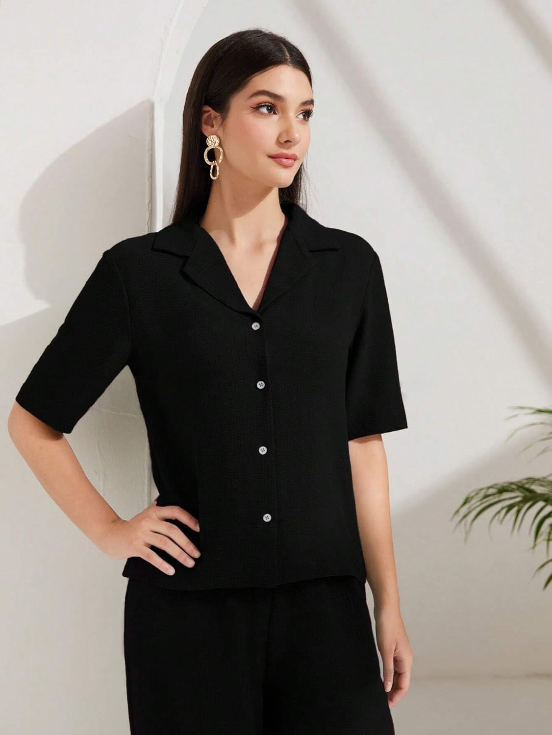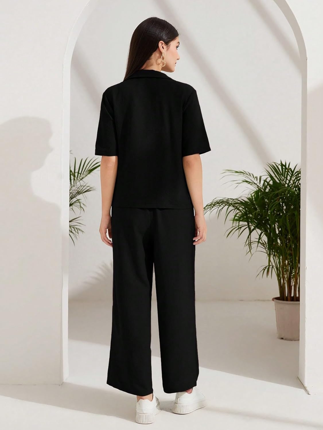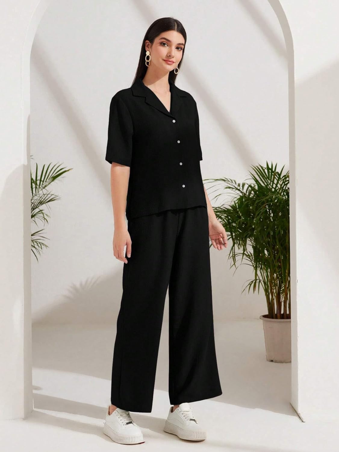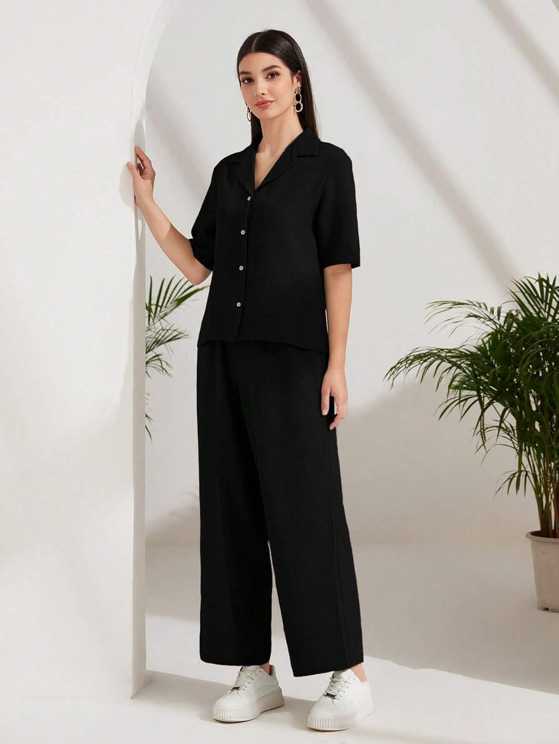 Step into effortless style with this chic co-ord set. Featuring a relaxed-fit button-down shirt with a notched collar and short sleeves, paired with flowy wide-leg trousers, this set exudes sophistication and comfort. Crafted from lightweight, breathable fabric, it’s perfect for both casual outings and stylish loungewear. Pair it with sneakers for a laid-back look or dress it up with heels for an elevated ensemble.