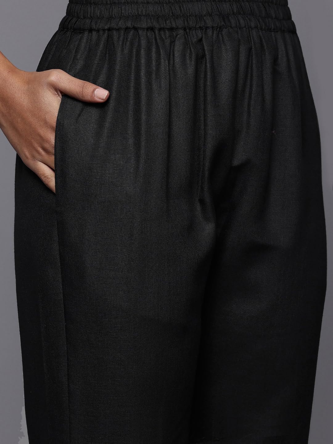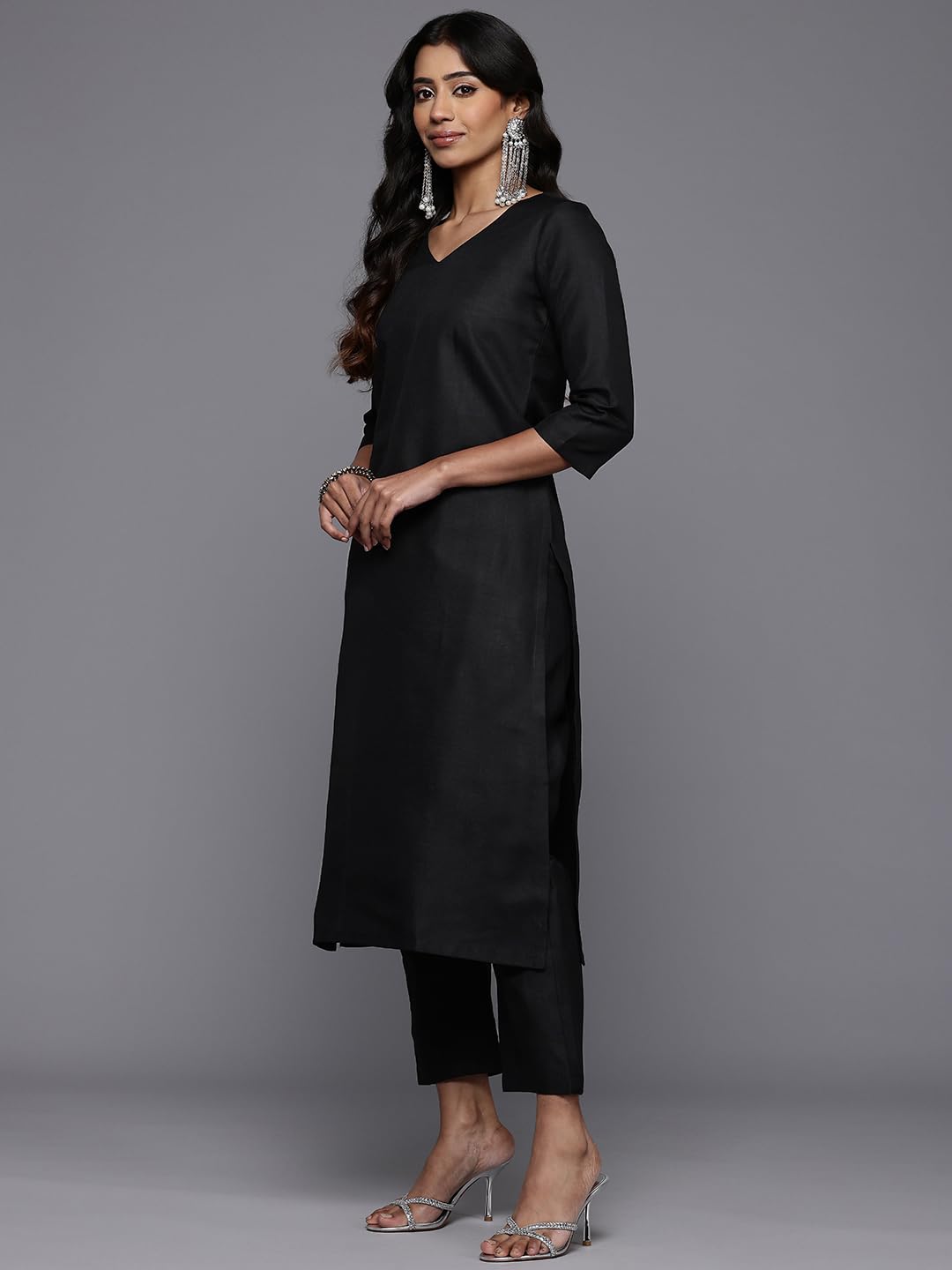 Solid Black Ruby V Neck, Three Quarter Sleeves, Straight Kurta Paired With Tonal Bottom And Printed Dupatta