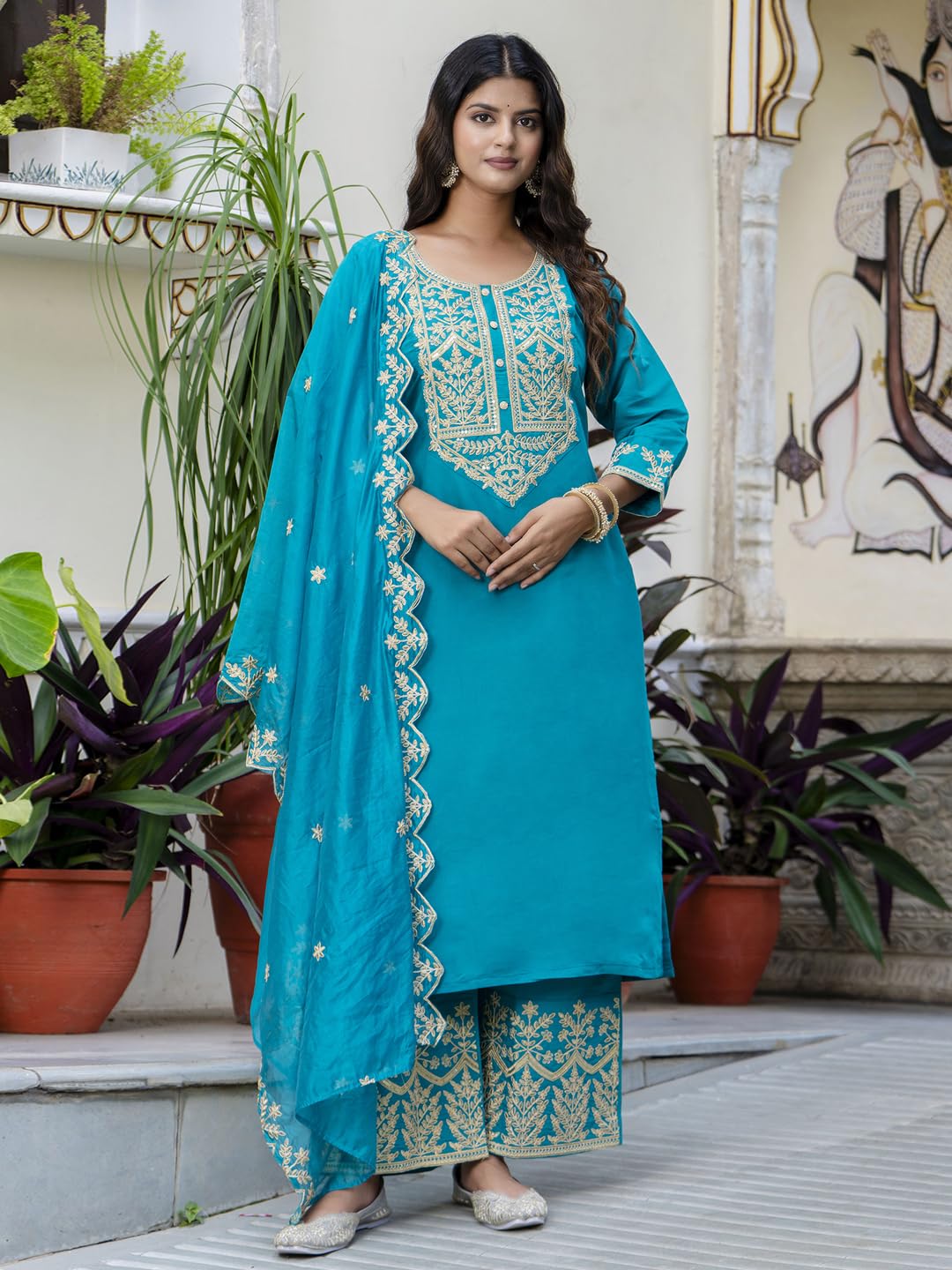 VredeVogel Women’s Silk Blend Embroidered Kurta Palazzo Set with Organza Dupatta