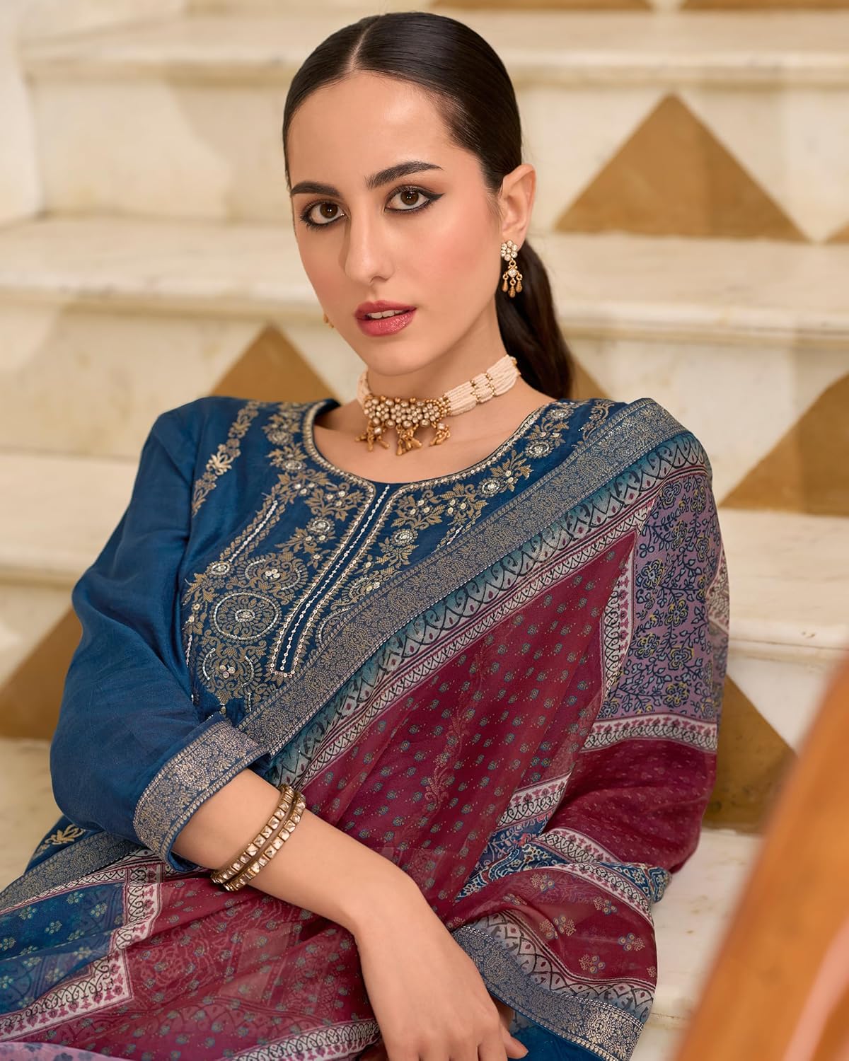 VredeVogel Women’s Viscose Self Jacquard Kurta with Pant & Organza Digital Print Dupatta Set