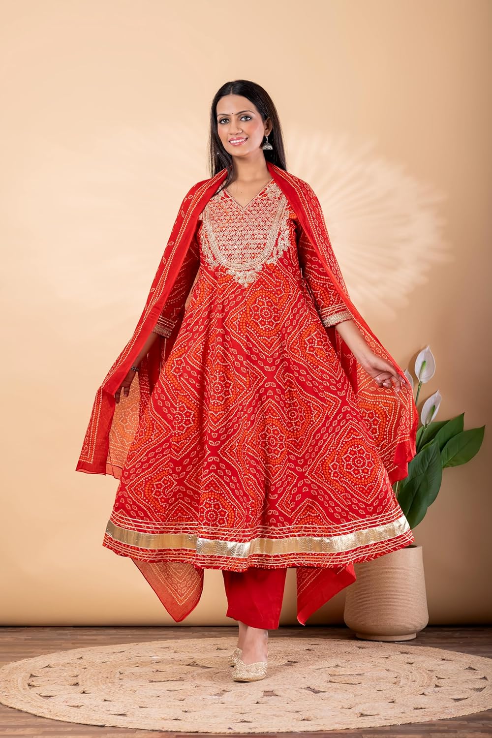 Women Pure Cotton Bandhej Print Embroidery Work Gown Kurti Pant and Dupatta Set