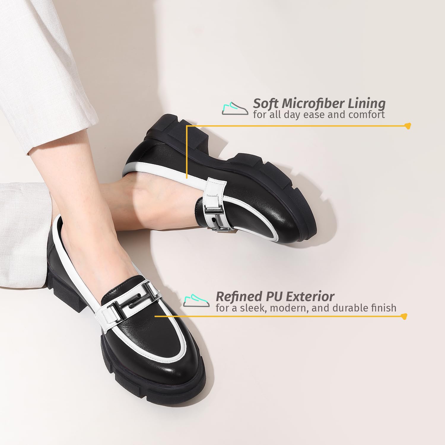 Elevate your style with Stella, designed for both sophistication and all-day comfort. Featuring a 1.5-inch platform heel, these loafers provide the perfect lift while ensuring stability and support. The premium PU upper offers a sleek, modern finish, while the microfiber lining keeps your feet soft and breathable. With a cushioned EVA foam insole, every step feels light and comfortable. The durable TPR sole offers excellent grip and flexibility, making these loafers perfect for both professional and casual wear. A stylish and versatile addition to any wardrobe, offering comfort and elegance all day long.